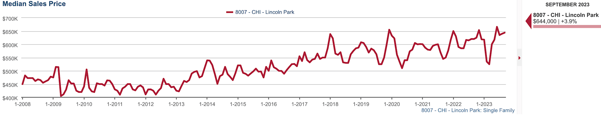 In the 3rd quarter of 2023, Lincoln Park's closed real estate transactions were down 24.4% when compared to the same period in 2022. Look at the graph below of monthly sales and note that we're using a 3-month rolling average (month-to-month data is too volatile and may not accurately represent current market trends). You can see the outlier effects of the easing of COVID restrictions in 2021 and 2022, where transactions hit all-time highs. The headline 24.4% year-over-year decline in sales is less dramatic when you consider 2021 & 2022 as outlier years. However, the overall market is still very slow, and as you will see in the data and commentary below, current contracted properties, inventory levels, and market times, all point to our markets slowing even further from where we are now. The good news is that Lincoln Park's pricing is stable and continues to rise (covered below). The reduced demand we are experiencing - due to higher interest rates - is more than offset by historically low inventory levels. Buyers are hesitant to take on a new 7-8% mortgage rate, and sellers simply do not want to part with their rock-bottom 2% mortgage rates. The end result is a stalemate (no one wants to move), with both diminished supply and demand contributing to the slowdown.