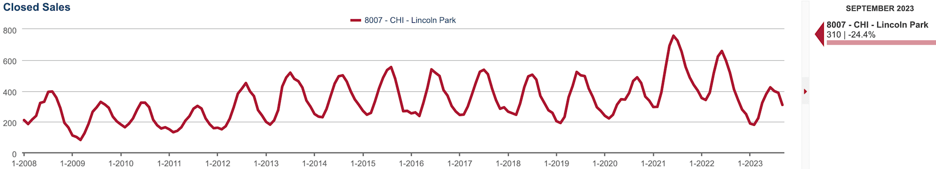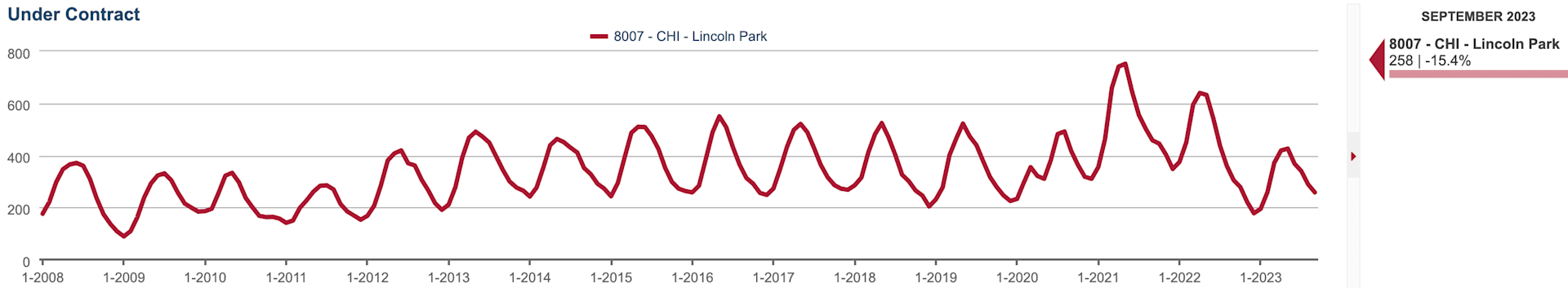 Home contract activity, when combined with current inventory levels, is easily the most important data to analyze if you hope to fully understand the current state of the real estate market. Q3's headline number shows a 15.4% decline in year-over-year contracts written for Lincoln Park SFHs and condos. While the number alone is concerning, it's less of a concern when you consider inventory levels are also down 32.9% over the same period. Higher interest rates and lower inventory levels are the catalysts for the steep reduction in real estate transactions we are experiencing in Lincoln Park. This decrease in contracts written is not a direct indication of direction on valuation, but it does indicate that October and November closings will once again be at historic lows.