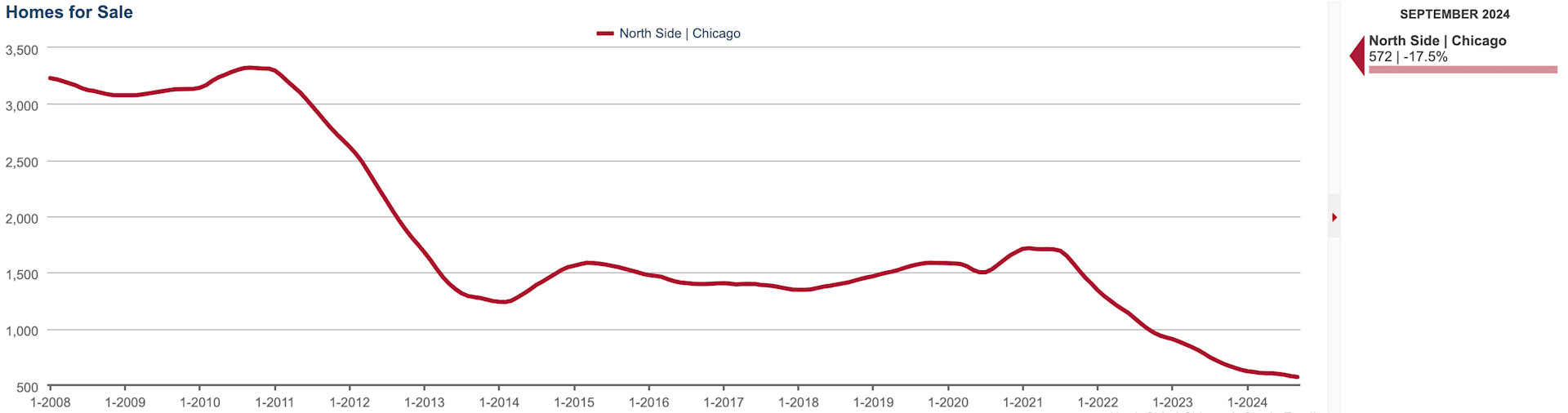 How slow is the current real estate market? We're actually experiencing the slowest market in over a decade, and current inventory data suggests we will most likely slow further from here. Unless for a life-changing event, people simply don't want to move. Buyers are hesitant to purchase with current mortgage rates hovering around 6%, and sellers are equally unwilling to give up their historically low 2-3% mortgages. The result is a stalemate, with an extremely slow but appreciating real estate market. Total real estate transactions on the North Side of Chicago are down another 2.4% year-to-date, down again from 2023's 35% decline. Inventory levels (homes & condos listed for sale) are at historic lows, indicating that outside of an unexpected catalyst, the market's slow pace should continue into the 2025 selling season. While each neighborhood's data is unique, the general slow-market trend is consistent throughout Chicago.