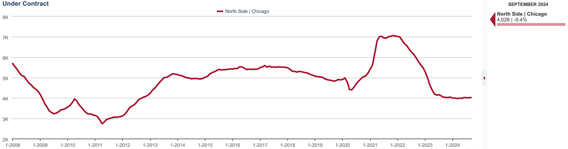As of September 30th, closed real estate transactions on Chicago's North Side declined 2.4% when compared to the same period in 2023. Take a look at the graph below of monthly sales and note that we're using a 12-month rolling average (month-to-month data is too volatile and may not accurately represent current market trends). You can see the outlier effects of the easing of COVID restrictions in 2021 and 2022, where transactions hit all-time highs. The headline 2.4% year-over-year decline in sales is a further decrease from 2023's 35% decline. We are trending at decade lows in sales volume and as you will see in the data and commentary below, contracted properties and inventory levels point to a market with the potential to slow even further from here.