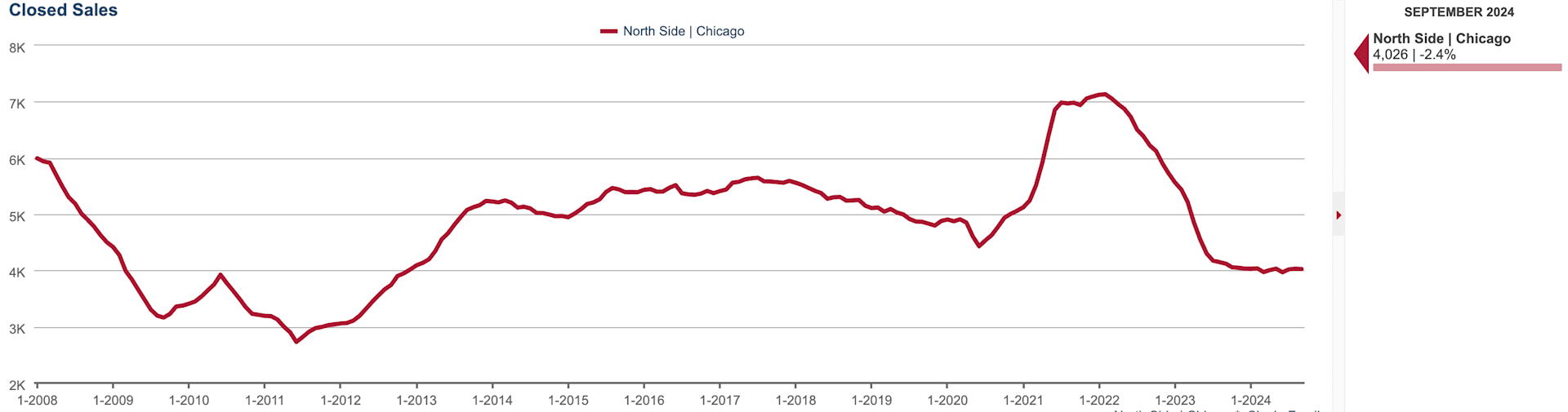 In this newsletter we will dissect the current state of the North Side of Chicago real estate market (defined as North Ave - Lawrence, and Lake Michigan west to California Ave. Chicago neighborhoods of Lincoln Park, Lakeview, Bucktown, Lakeview, Roscoe Village, North Center & Lincoln Square / Ravenswood), including what's causing the slowdown, current inventory levels, valuations, and our prediction for the remainder of 2024 and into 2025. Let's get started and dive into the numbers...
